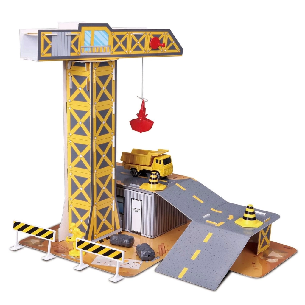 İnşaat, polis, yarış ve itfaiye temalı çeşitli aksesuarlar ve bir oyuncak araç içeren, montajı kolay bir set içerir.