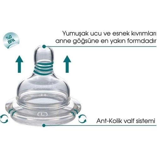 Mamajoo biberon emziğinde bulunan anti kolik valf, beslenme sırasında bebeklerin hava yutma riskini engellemeye yardımcıdır.