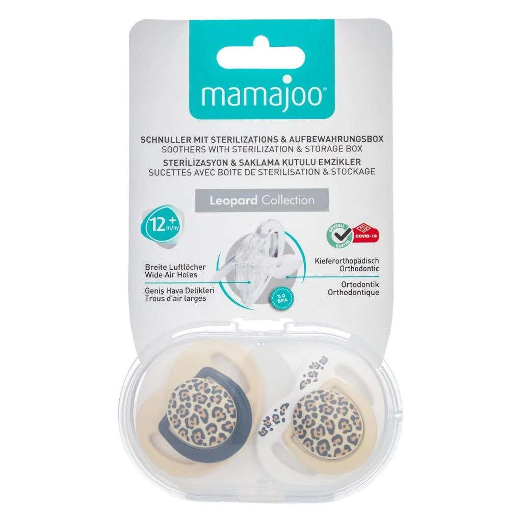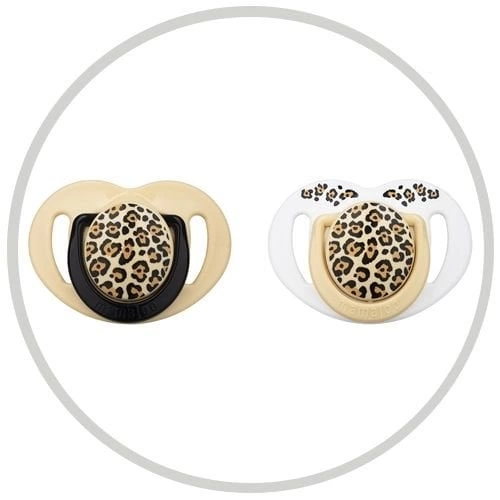 Mamajoo Sterilizasyon ve Saklama Kutulu İkili Desenli Ortodontik Bej Leopar Emzikler 0-24 ay bebekler için 3 farklı boyda, uyumlu renk ve desen seçenekleriyle üretilir.