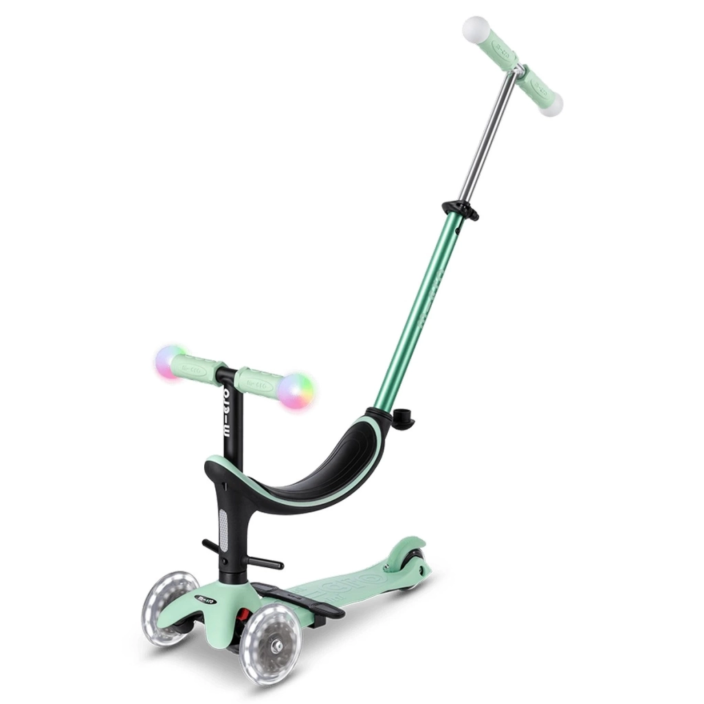 Yenilikçi ve ergonomik hepsi bir arada scooter farklı varyasyonlarda kullanılabilir: başlangıçta koltuklu, iki ayak dayanağı