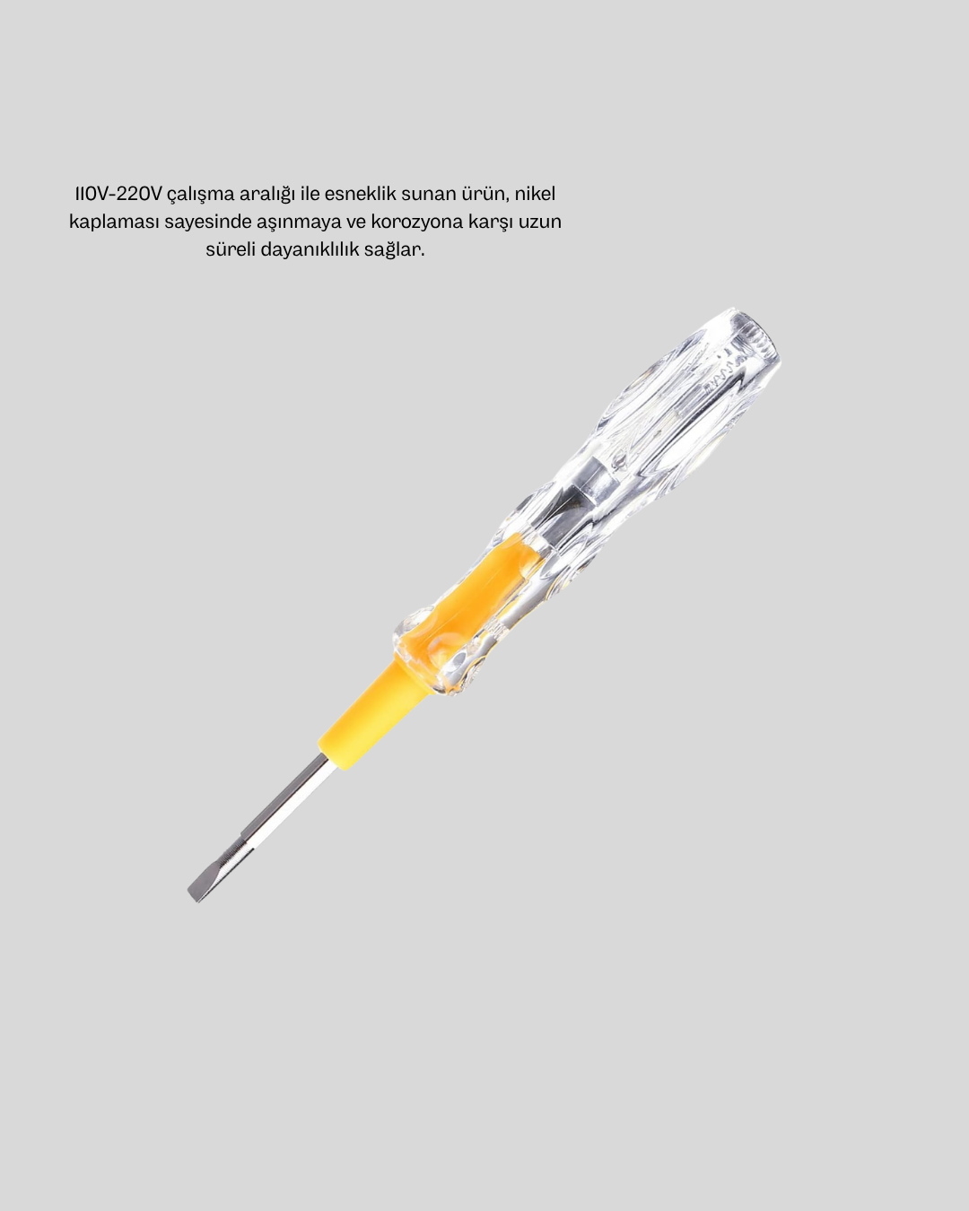 Yüksek güvenlik ve dayanıklılığı bir arada sunan bu profesyonel neon kontrollü kontrol kalemi, hem ev tipi hem de endüstriyel elektrik uygulamaları için ideal bir seçimdir. Tam sızdırmazlık sağlayan pirinç kapak, ürünün uzun ömürlü olmasını sağlarken, elektrik kaçaklarını önleyerek maksimum güvenlik sunar. Şeffaf yalıtkan sapı, elektrik yalıtımı görevini mükemmel şekilde yerine getirir ve kullanım sırasında darbeye karşı üstün direnç gösterir.Kalem üzerindeki neon lamba, aktif akımın varlığını kolayca görmenizi sağlar. Bu sayede 110V – 220V arasındaki geniş çalışma aralığında, enerji hattı kontrolü ve elektrik testi işlemleri son derece güvenli ve pratik hale gelir. Özellikle düşük ışıklı ortamlarda bile neon göstergesi sayesinde net görünürlük sağlanır.Nikel kaplama uç kısmı, oksitlenmeye ve aşınmaya karşı ekstra koruma sunar; böylece uzun yıllar boyunca ilk günkü performansını korur. Hassas işlenmiş uç tasarımı, vida yuvalarına tam oturarak yüksek temas yüzeyi oluşturur ve doğru ölçüm yapmanızı sağlar.Profesyonel standartlarda üretilen bu kontrol kalemi, tamir, montaj, bakım ve elektrik test işlemlerinde güvenli kullanım sağlar. Ev kullanıcıları, teknisyenler ve ustalar için vazgeçilmez bir yardımcıdır.Kompakt boyutu sayesinde cebinizde veya alet çantanızda kolayca taşınabilir. Güvenliği, dayanıklılığı ve ergonomik yapısıyla bu test kalemi, her elektrik uygulamasında profesyonel sonuçlar elde etmenizi sağlar.