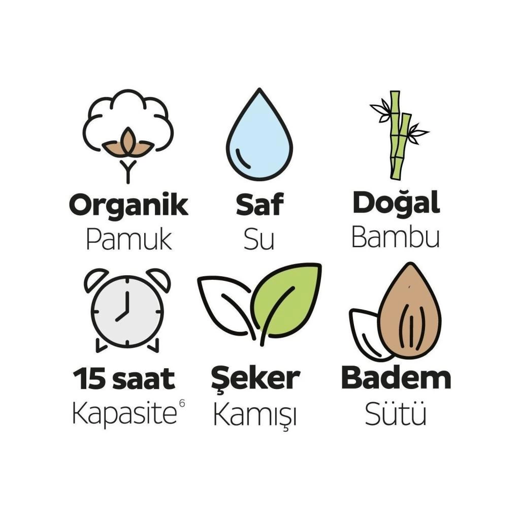 Emici ve kuruluk performansı yüksek lifleri sayesinde 15 saate kadar kuruluk sağlar.