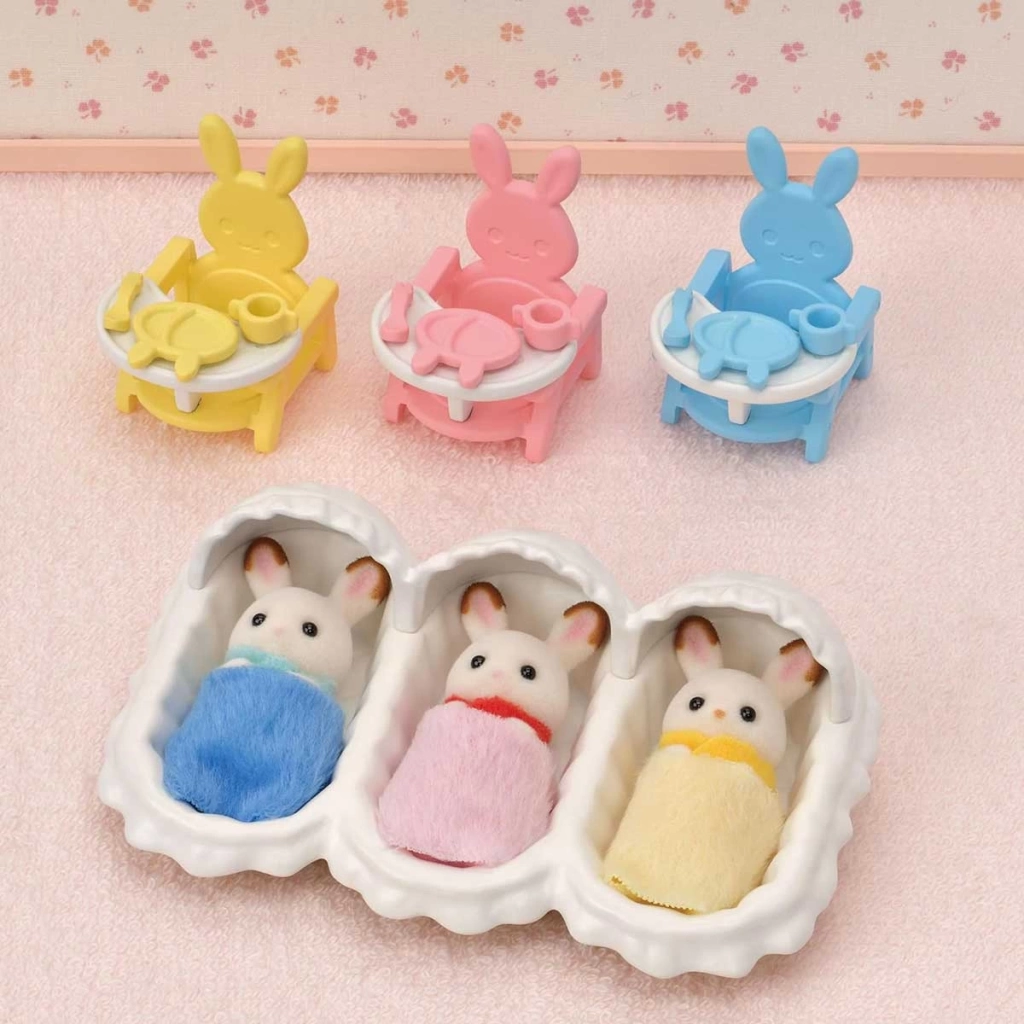 Çikolata Kulaklı Tavşan Üçüzler, battaniyeleri, beşikleri, mavi, pembe ve sarı mama sandalyeleri, tabakları, kaşıkları