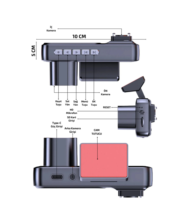 Bu sistem, sürüş güvenliğinizi artırmak için ön, iç ve arka kameraları bir arada sunar. Ön kamera 1080p Full HD çözünürlüğüyle detayları net kaydederken; 720p HD iç ve arka kameralar; yolcu hareketleri, aracın iç durumu ve park esnasındaki çevre izleme gibi fonksiyonlar sağlar. Özellikle şehir içi yolcularda ve aile kullanımlarında, araç içi huzuru koruma altına alır. 170° geniş açılı lensler sayesinde kör noktalar ortadan kalkar. Döngüsel kayıt özelliğiyle sürekli kayıt alınabilir; 64 GB’a kadar destekli hafıza sayesinde uzun yolculuklarda bile görüntüler depolanabilir. G‑sensör ve hareket algılama teknolojileri sayesinde kaza anları veya park halindeki darbelere karşı otomatik korumaya geçer. Dahili lityum batarya, Wi‑Fi bağlantı ve uygulama desteğiyle tüm kontrol parmaklarınızın ucundadır.