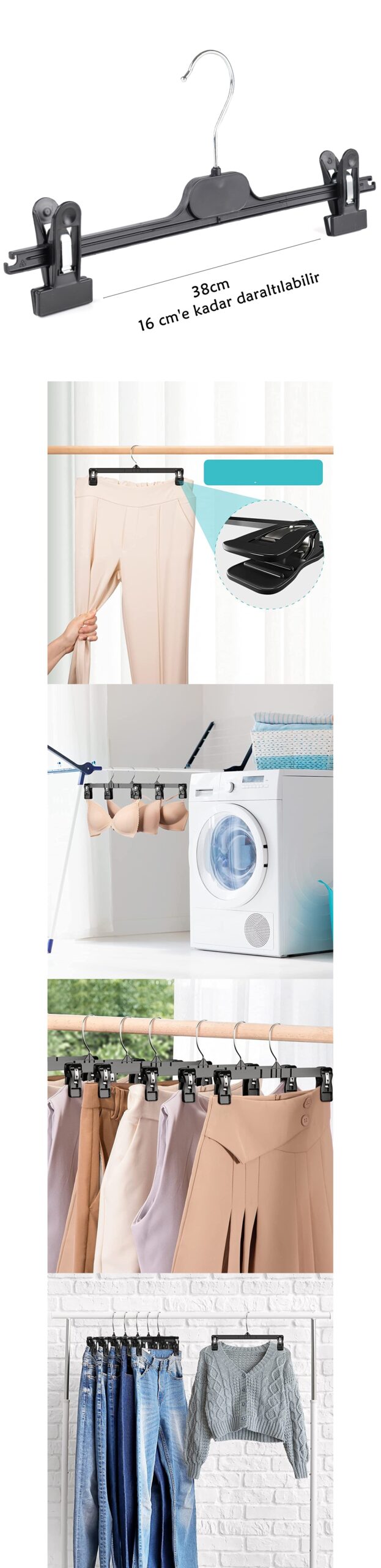 ERGONOMİK : Elbise askılarındaki 8 adet ayarlanabilir klips, etekleri ve pantolonları kolaylıkla tutar ve pantolon askılarındaki kesik çentikler, ince omuz askılarını güvenli bir şekilde yerinde tutar. Klipsli askıları sayesinde pantolon veya etek gömleklere kolayca asılabilir.