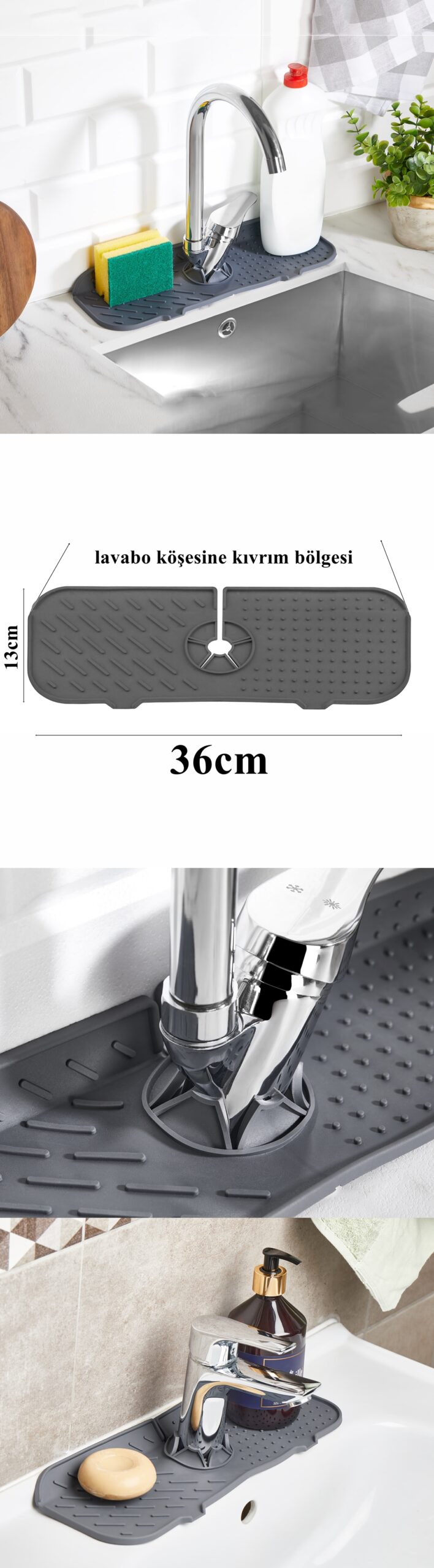 Sadece musluk kurutma matı olarak değil, diş fırçanızı, bardağınızı, el sabununuzu ve bulaşık sabununuzu koyabileceğiniz tasarımda üretilmiştir.