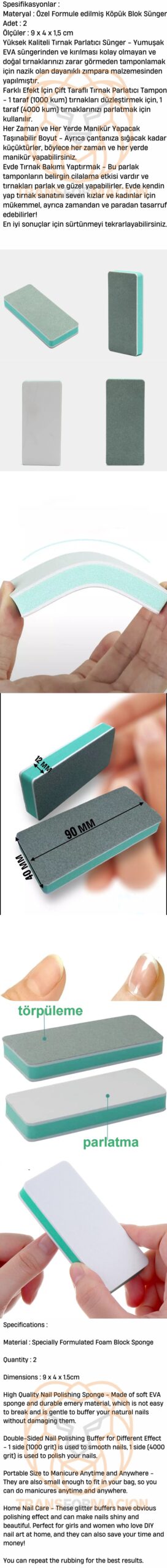 Yüksek Kaliteli Tırnak Parlatıcı Sünger – Yumuşak EVA süngerinden ve kırılması kolay olmayan ve doğal tırnaklarınızı zarar görmeden tamponlamak için nazik olan dayanıklı zımpara malzemesinden yapılmıştır.