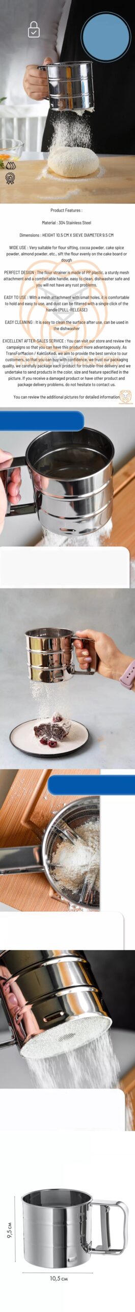 GENİŞ KULLANIM ALANI : Un eleme, kakao tozu, kek baharat tozu, badem tozu vb. için çok uygundur, unu pasta tahtası veya hamur üzerine eşit olarak eleyin