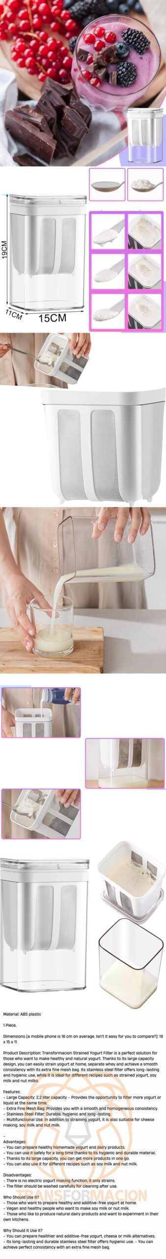 – Çok Fonksiyonlu Kullanım: Yoğurt süzmenin yanı sıra, peynir yapımı, soya sütü ve kuruyemiş sütleri için de uygundur.