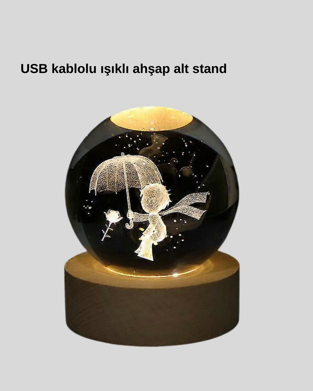 USB Gece Lambası LED 3D Küçük Prens Kristal Top Lambası, evinize masalsı ve romantik bir atmosfer katan özel bir dekor ürünüdür. 8 cm çapındaki kristal kürenin içinde lazer teknolojisi ile işlenmiş Küçük Prens figürü, kristalin berrak dokusunda adeta havada süzülüyormuş gibi görünür. Bu estetik detay, ürünü sıradan bir gece lambasının çok ötesine taşıyarak hem yetişkinler hem çocuklar için büyüleyici bir ışık kaynağı haline getirir.3000K sıcak LED ışığı, yumuşak bir ambiyans oluşturarak uyku öncesi gevşemek isteyenler için mükemmel bir atmosfer yaratır. Masif ahşap tabanı, doğal dokusuyla ürünün modern tasarımını tamamlar. USB ile çalıştığı için priz adaptörü, bilgisayar veya powerbank üzerinden rahatlıkla kullanılabilir. Açma–kapama düğmesi ile pratik kullanım sunar.Küçük Prens hayranları, çocuklar, romantik dekor seven yetişkinler için mükemmel bir hediye seçeneğidir. Doğum günlerinde, yılbaşında, sevgililer gününde veya özel bir sürpriz yapmak istediğinizde bu lamba ideal bir tercihtir. Hem dekoratif hem fonksiyonel yapısıyla her mekana uyum sağlar.