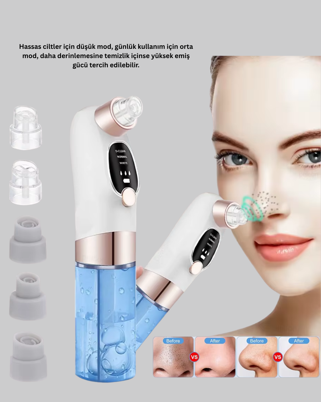Cildinize pürüzsüzlük ve tazelik kazandırmak artık çok kolay! Bu vakum teknolojili siyah nokta temizleyici, güçlü emiş sistemiyle gözeneklerdeki kir, yağ ve siyah noktaları nazikçe temizler.3 farklı kademe ayarıyla her cilt tipine özel temizlik sağlar — hassas, normal ve derin bakım modlarıyla maksimum etki sunar.Cilt dostu tasarımı sayesinde yüzünüzde tahriş yaratmadan etkili temizlik yapar.Titreşim masaj özelliği, kan dolaşımını hızlandırarak cilt hücrelerini canlandırır. Düzenli kullanımda gözenekler sıkılaşır, cilt tonu eşitlenir ve daha aydınlık bir görünüm ortaya çıkar.Kullanımı son derece pratik olan bu cihaz, su haznesiyle birlikte çalışarak temizlik sırasında cildin nem dengesini korur. Kompakt ve taşınabilir boyutuyla hem evde hem seyahatte kolayca kullanılabilir.Dayanıklı yapısı ve uzun ömürlü performansı sayesinde güvenle tercih edilebilir.Siyah noktalardan kurtulmak, cildinize parlaklık kazandırmak ve profesyonel bir bakım etkisi yaratmak istiyorsanız bu cihaz tam size göre!