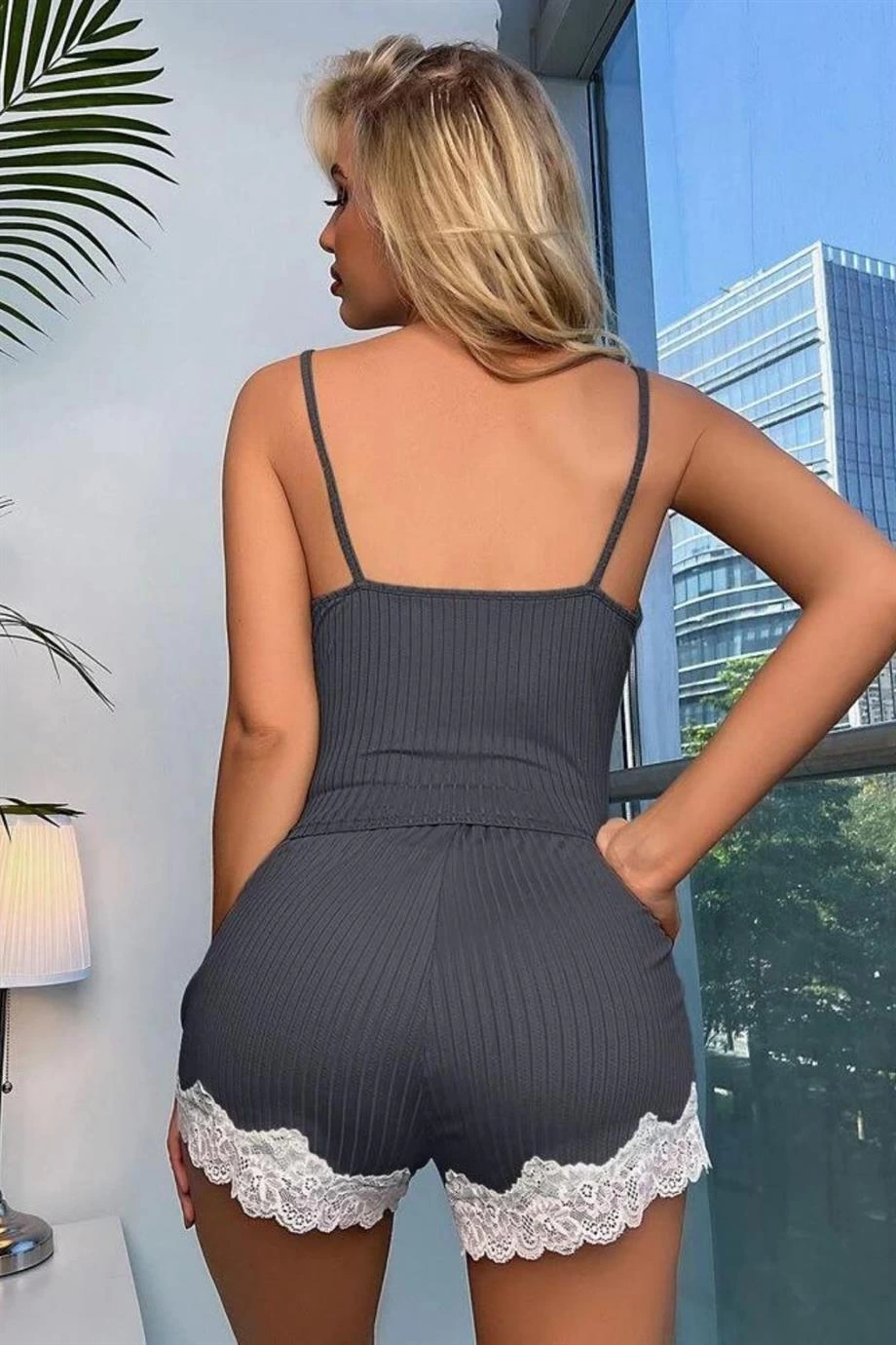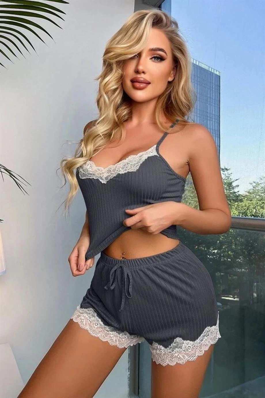 YNT Viskon Antrasit Dantel Detaylı Şık Şortlu Takım 7000