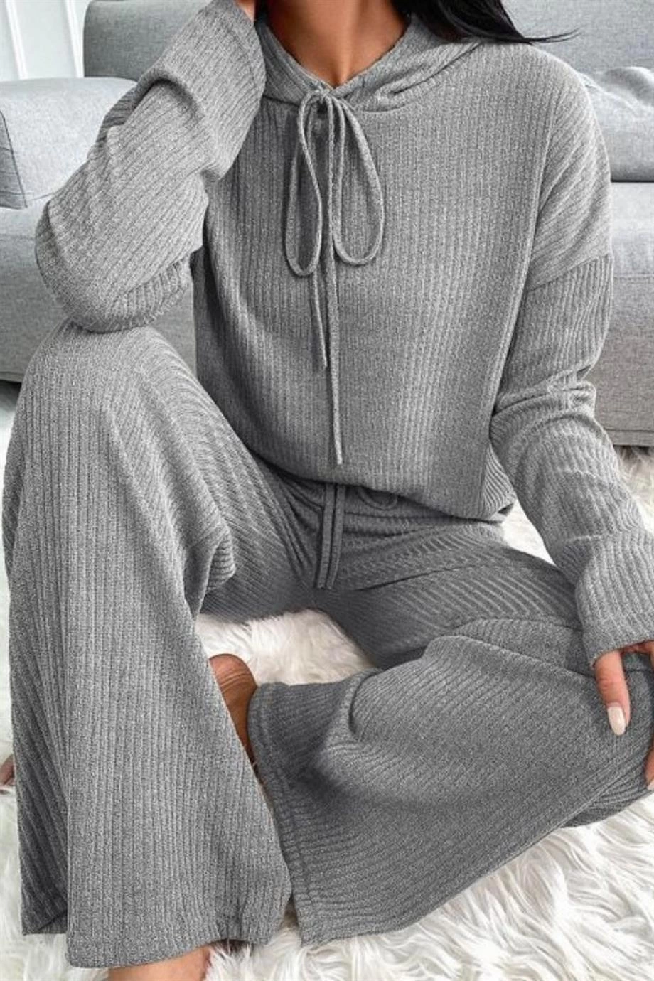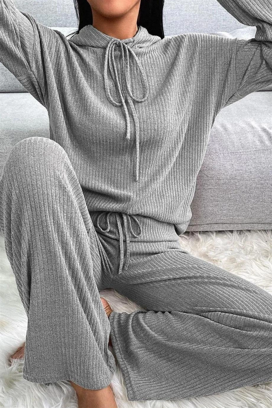 YNT Viskon Gri Kapüşonlu Uzun Kollu İkili takım 7009