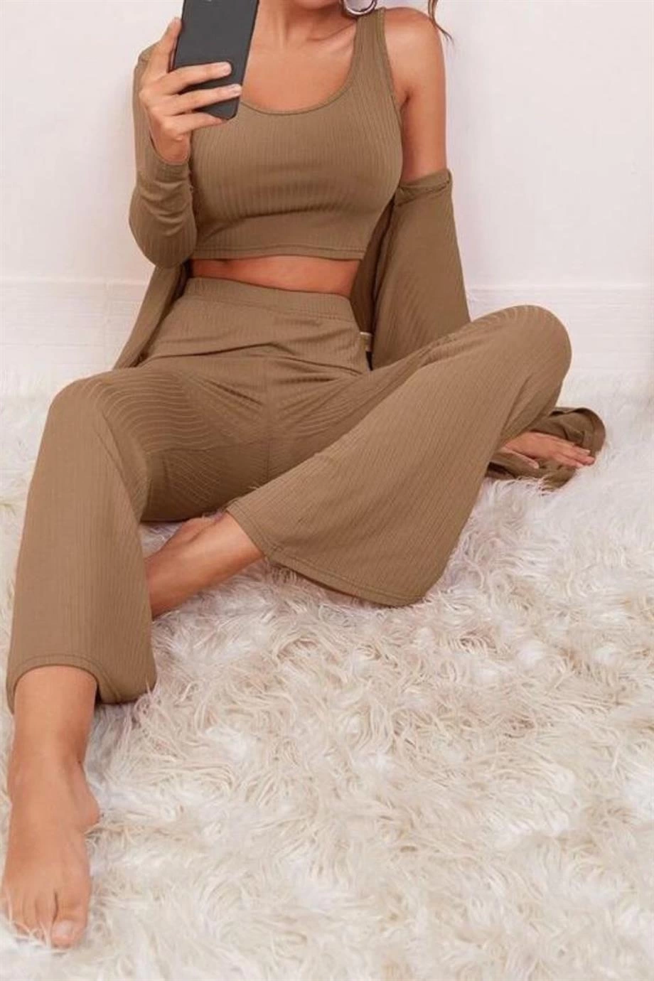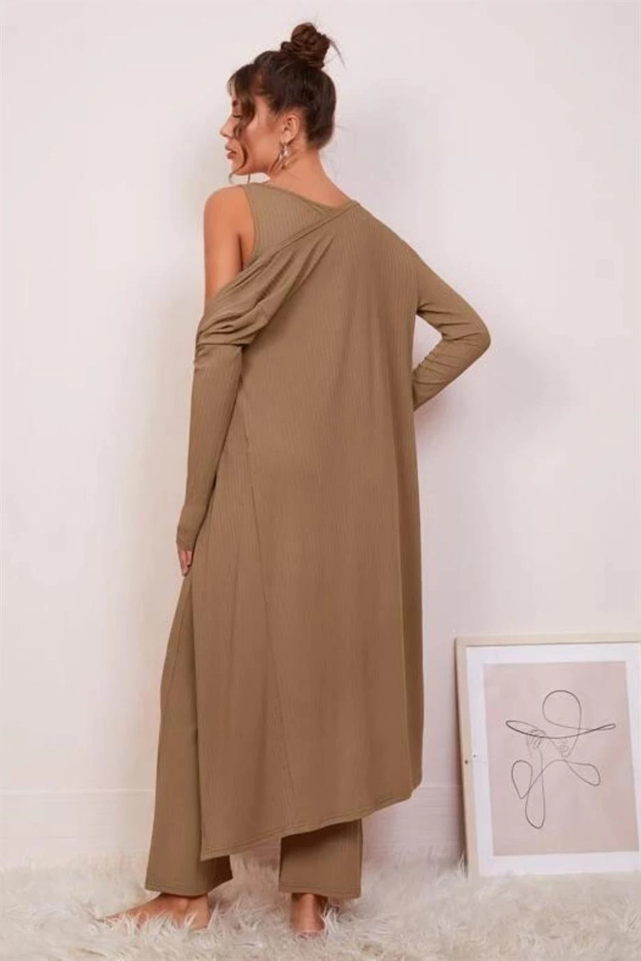 YNT Viskon Soluk Kahverengi 3 lü Crop Takım 7007